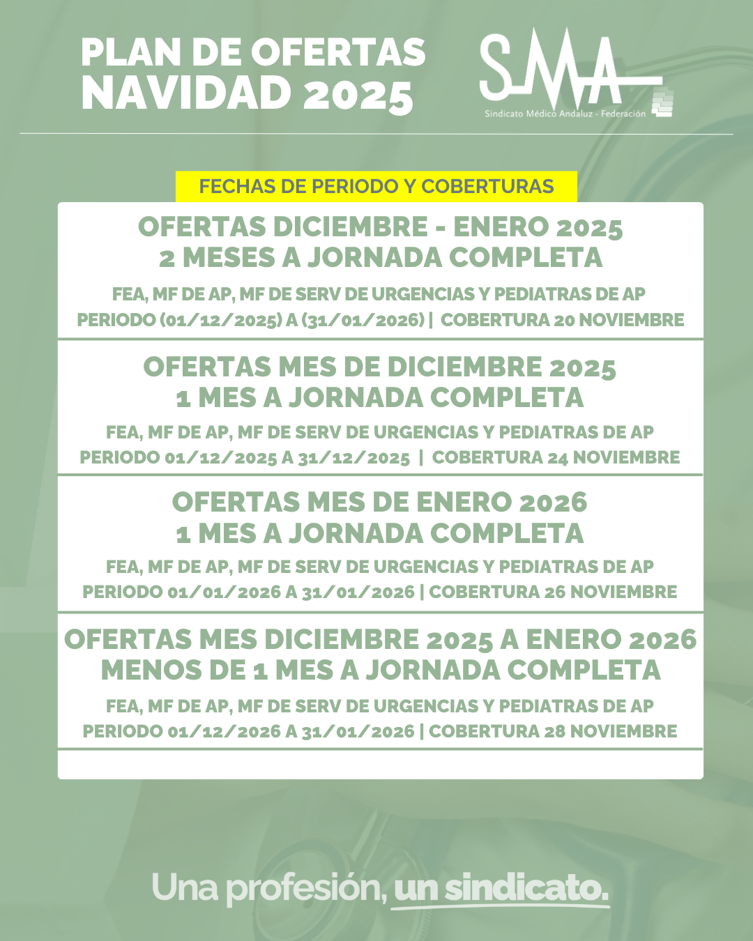 Las primeras ofertas para FEA, Médicos de Familia de Urg y AP y Pediatras de AP se realizarán a través de la Bolsa Única de Empleo del SAS que comienza el 20 de noviembre con la oferta de diciembre 2025 a enero 2026 a jornada completa.